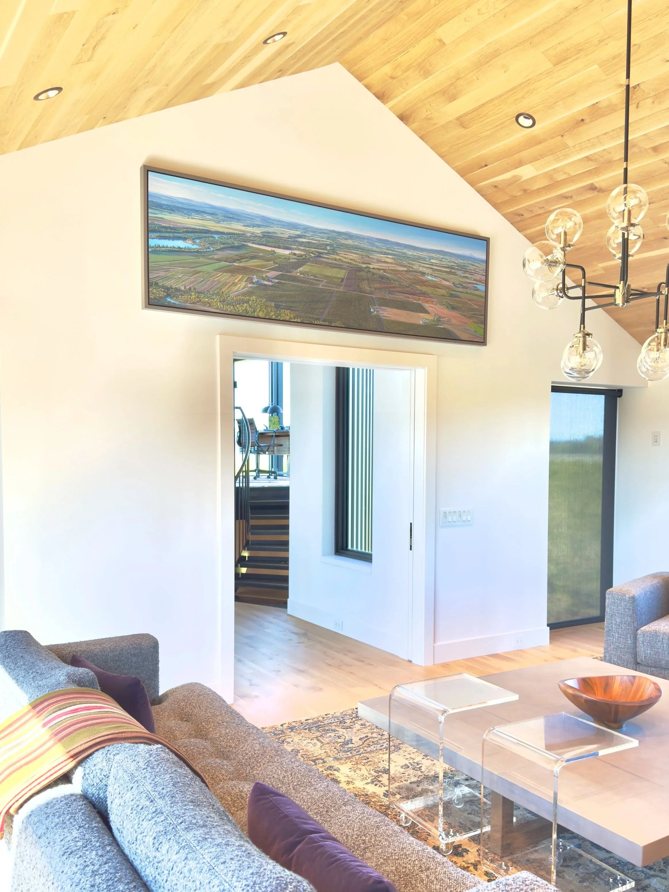 The Willamette flows north through northwestern Oregon into the Columbia River on the Oregon/Washington border. Its valley was sculpted by the Missoula Floods at the end of the last ice age and over time, it has been altered by countless floods and farmers. The painting was commissioned by a family whose members have been farming the area for over 200 years.